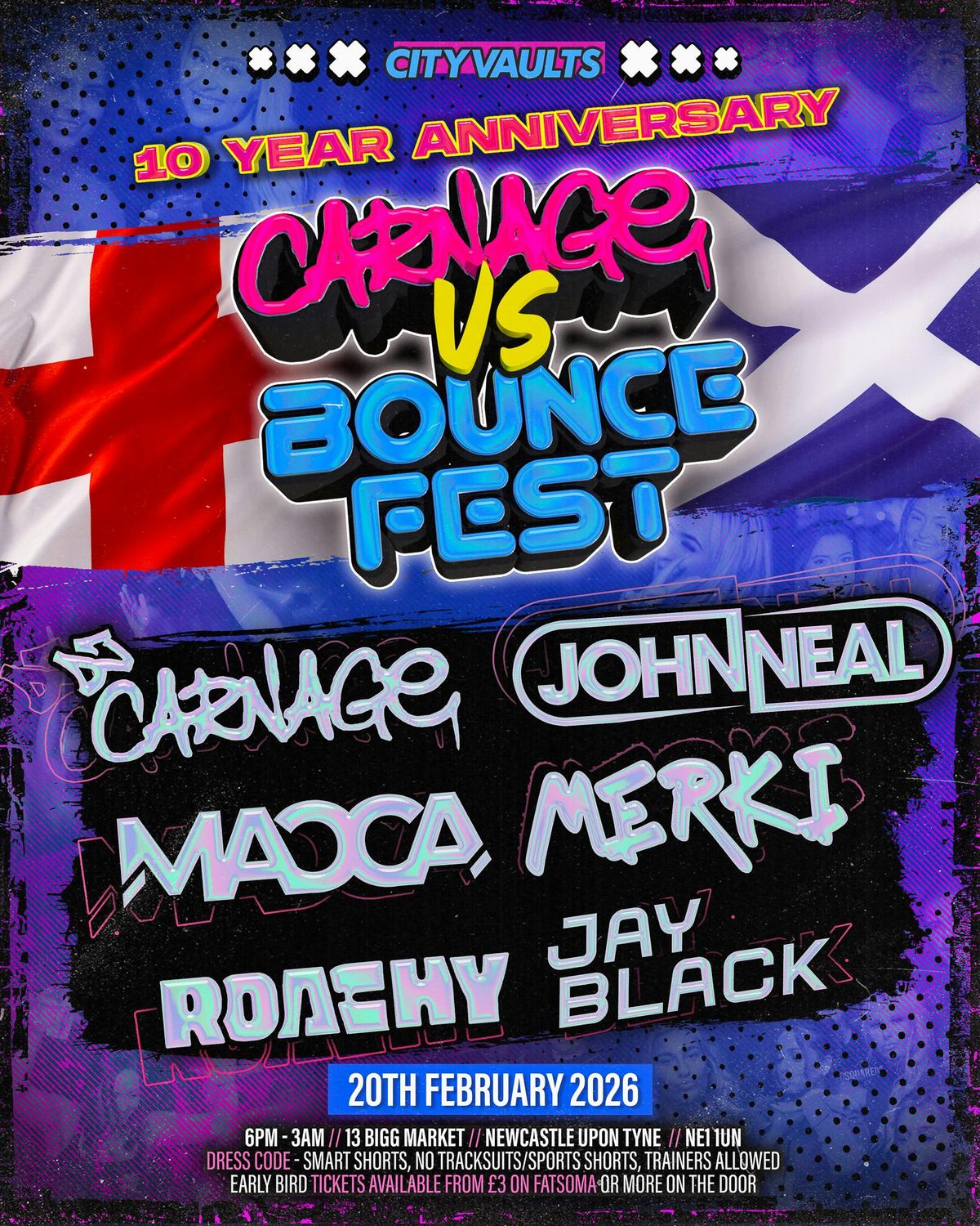 🍻🔥CARNAGE v BOUNCFEST 🔥🍻City Vaults is celebrating a proper milestone, and we’re doing it the only way possible – maximum chaos.🎉 10 YEARS of City Vaults🎧 10 YEARS of the icon DJ Carnage reppin’ the decks🎂 AND it’s his birthday inal