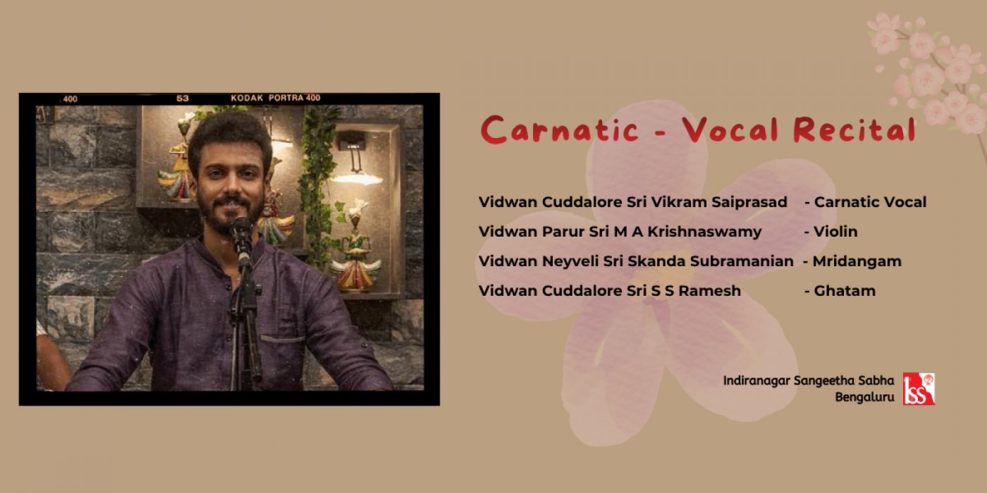 Indiranagar Sangeetha Sabha warmly invites rasikas to an immersive evening of classical music featuring Vidwan Cuddalore Sri Vikram Saiprasad, a vocalist known for his depth, classicism, and emotive delivery. His music blends tradition with finesse, offering listeners a rich and rewarding concert experience.