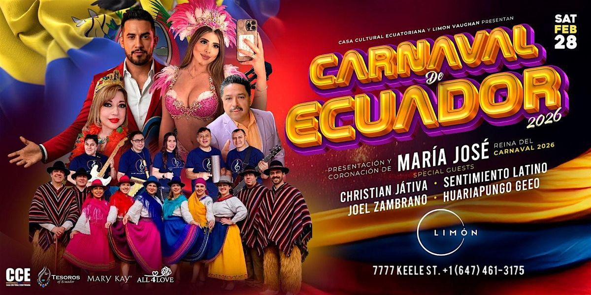 Este 28 de febrero, vive una noche llena de color, ritmo y tradición con el Carnaval de Ecuador en Limon, Vaughan. Celebra la música y la cultura ecuatoriana en un ambiente festivo e inolvidable.