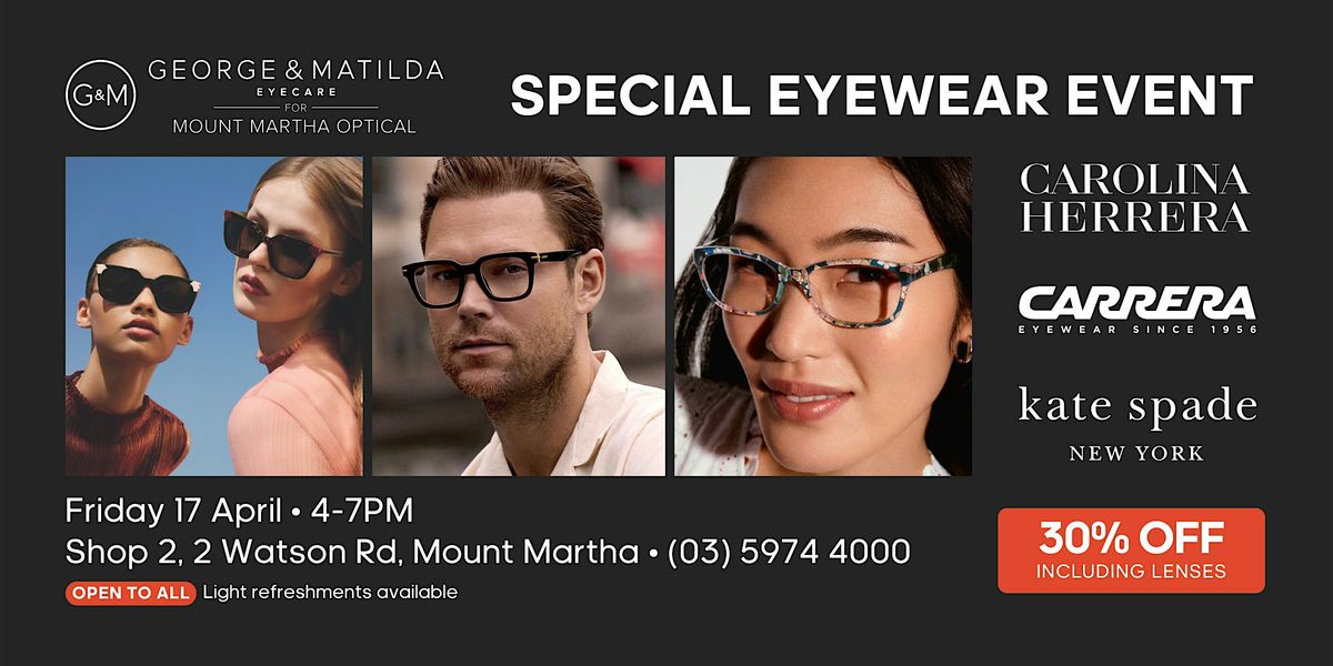 As a VIP of George & Matilda Mount Martha, you will be entitled to a 30% discount across all 3 brands: Carolina Herrera, Kate Spade and Carrera eyewear (plus 30% off lenses), in practice for this event. Terms & conditions apply.