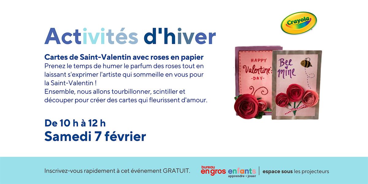 Découvrez une toute nouvelle façon de célébrer la Saint-Valentin ! Notre atelier de création de cartes de Saint-Valentin avec des roses en papier allie créativité, couleurs et plaisir dans une session passionnante. Vous apprendrez à rouler des roses en papier, à ajouter des tiges scintillantes et à nouer des rubans festifs pour créer une carte qui fleurit d'amour.