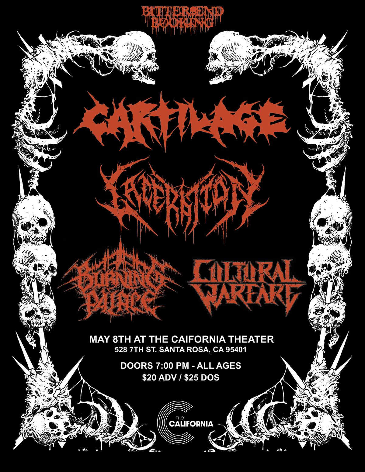 Cartilage, Laceration, Burning Palace and Cultural Warfare at the California Theater in Santa Rosa.About this Event