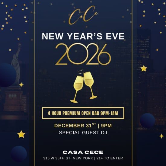Highlights 🔮 Become mesmerized by Casa Cece´s suave ambiance with draped interiors and moody lighting for a sleek, intimate vibe 🎧 Dance to live DJ sets that keep the room buzzing all night 🍸 Enjoy 4-hour premium open bar from 9 p.m. to 1 a.m. 🌈 Experience immersive lighting, sound, and design for an unforgettable vibe General Info 📅 Date: December 31 🕐 Time: 9:00 PM – Late 📍 Location: Casa CeCe, New York 👤 Age: 21+ (Valid ID required for entry) 🍹 Open Bar: 4-hour premium open bar from 9 p.m. to 1 a.m. 👗 Dress Code: Dress to impress Description Ring in 2026 in style at Casa CeCe, one of NYC’s most design-forward venues, featuring cutting-edge intelligent LED lighting, a German-engineered DB sound system, and an intimate yet electric atmosphere built for dancing, connection, and extraordinary moments. Whether you’re enjoying the ambiance in the sleek Pink Salon Mezzanine or immersed in the main room where Casa CeCe has hosted Cirque-du-Soleil–style performances by world-renowned talent, every corner of the venue is crafted to engage and inspire. With a 4-hour open bar and a live DJ spinning all night, every moment is curated for unforgettable celebration. Come dressed to impress and get ready for Casa CeCe NYE Celebration with 4-Hour Premium Open Bar ! Get your tickets now!