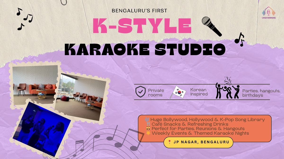 Welcome to Casa Karaoke, Bangalore’s first dedicated karaoke studio where music, fun, and community come together! More than just a singing space, Casa Karaoke is a lively hub for birthdays, reunions, parties, corporate gatherings, or simply an unforgettable weekend hangout.Step into an atmosphere inspired by the vibrant karaoke culture of Korea and Japan. Choose from private K-style and J-style rooms for cozy group sessions or take the spotlight with our stage-like setup that makes every performance feel larger than life. Whether you’re a bathroom singer finding your voice or a seasoned performer ready to shine, Casa Karaoke is the perfect stage for you.Get access to a massive song library featuring Bollywood classics, Hollywood hits, K-Pop sensations, and regional favorites. Dive into our signature events like Open Mics, Sur Bahaar concerts, Friday Music Jams, and themed nights. Refuel between performances with delicious food and refreshing drinks from our in-house Kafe Karaoke.With premium sound, warm ambience, and a truly inclusive vibe, every visit is designed to create lasting memories.At Casa Karaoke, the mic is yours—sing, celebrate, and feel the music like never before!