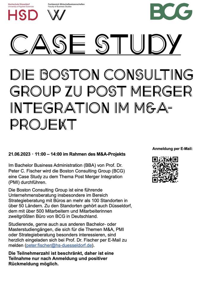 Im Bachelor Business Administration (BBA) von Prof. Dr. Peter C. Fischer wird die Boston Consulting Group (BCG) eine Case Study zu dem Thema Post Merger Integration (PMI) durchführen.Die Boston Consulting Group ist eine führende Unternehmensberatung insbesondere im Bereich Strategieberatung mit Büros an mehr als 100 Standorten in über 50 Ländern. Zu den Standorten gehört auch Düsseldorf, dem mit über 500 Mitarbeitern und Mitarbeiterinnen zweitgrößten Büro von BCG in Deutschland.