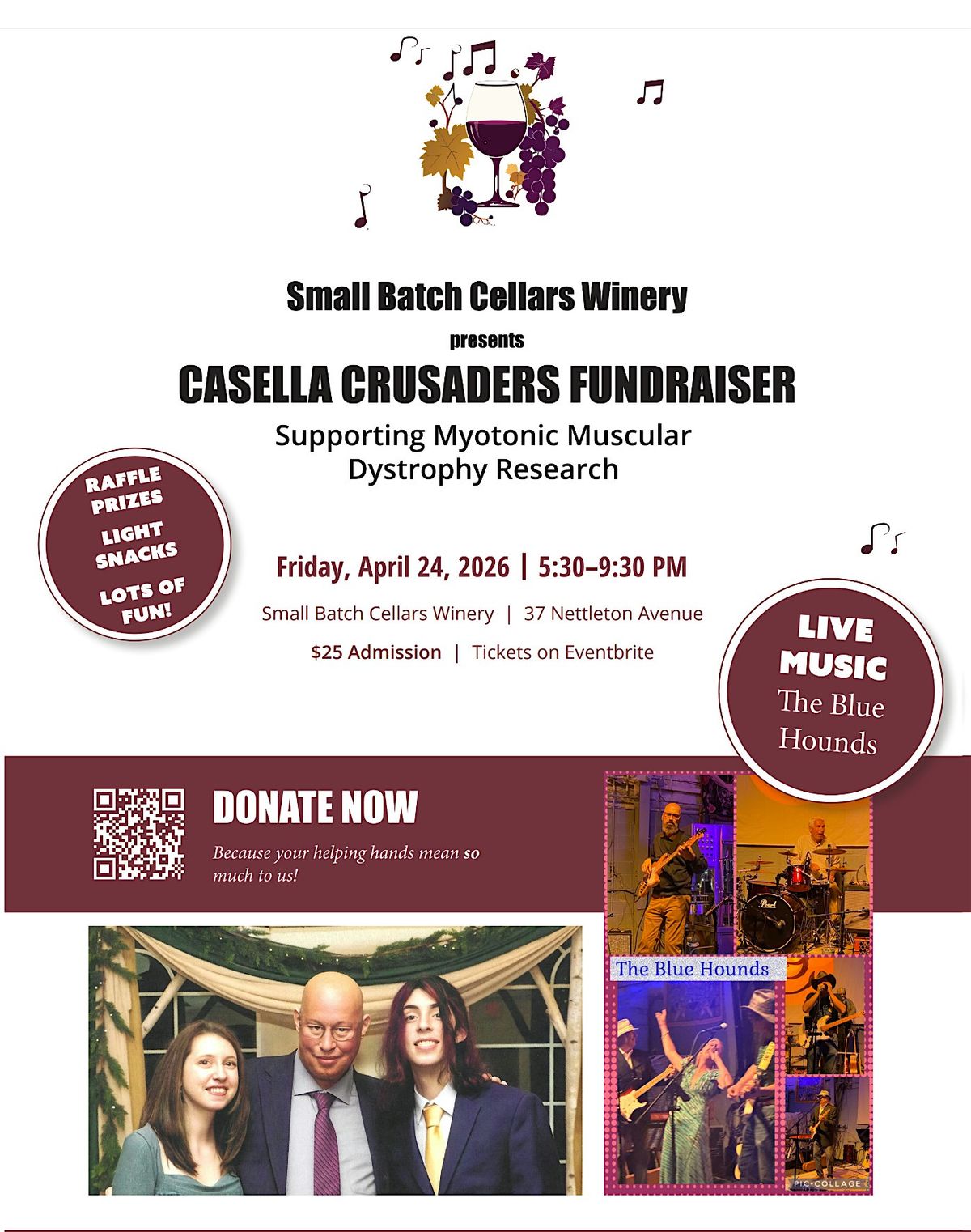 Join us for an unforgettable evening at Small Batch Cellars Winery as we come together for a meaningful cause. The Casella Crusaders Fundraiser is dedicated to supporting research for Myotonic Muscular Dystrophy and helping drive progress toward better treatments and a cure.