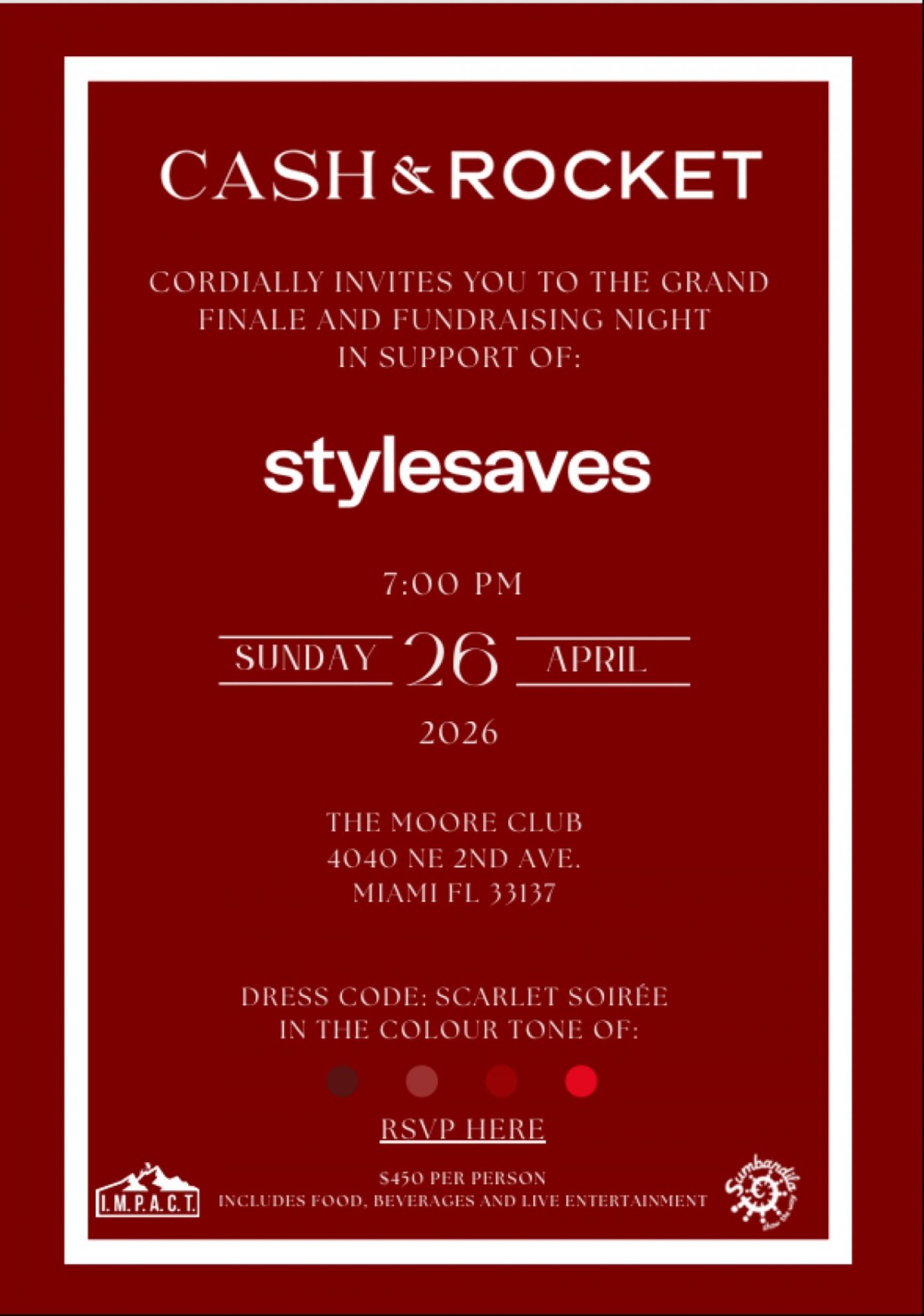 Taking place at 7:00 PM on Sunday, April 26, 2026, at The Moore Club in Miami’s Design District, this vibrant Scarlet Soirée will bring together philanthropists, tastemakers, and community supporters for an evening of purpose and celebration. Guests will enjoy curated cuisine, premium beverages, and live entertainment in a sophisticated setting, closing the Cash & Rocket journey with a memorable night dedicated to style, generosity, and meaningful impact.