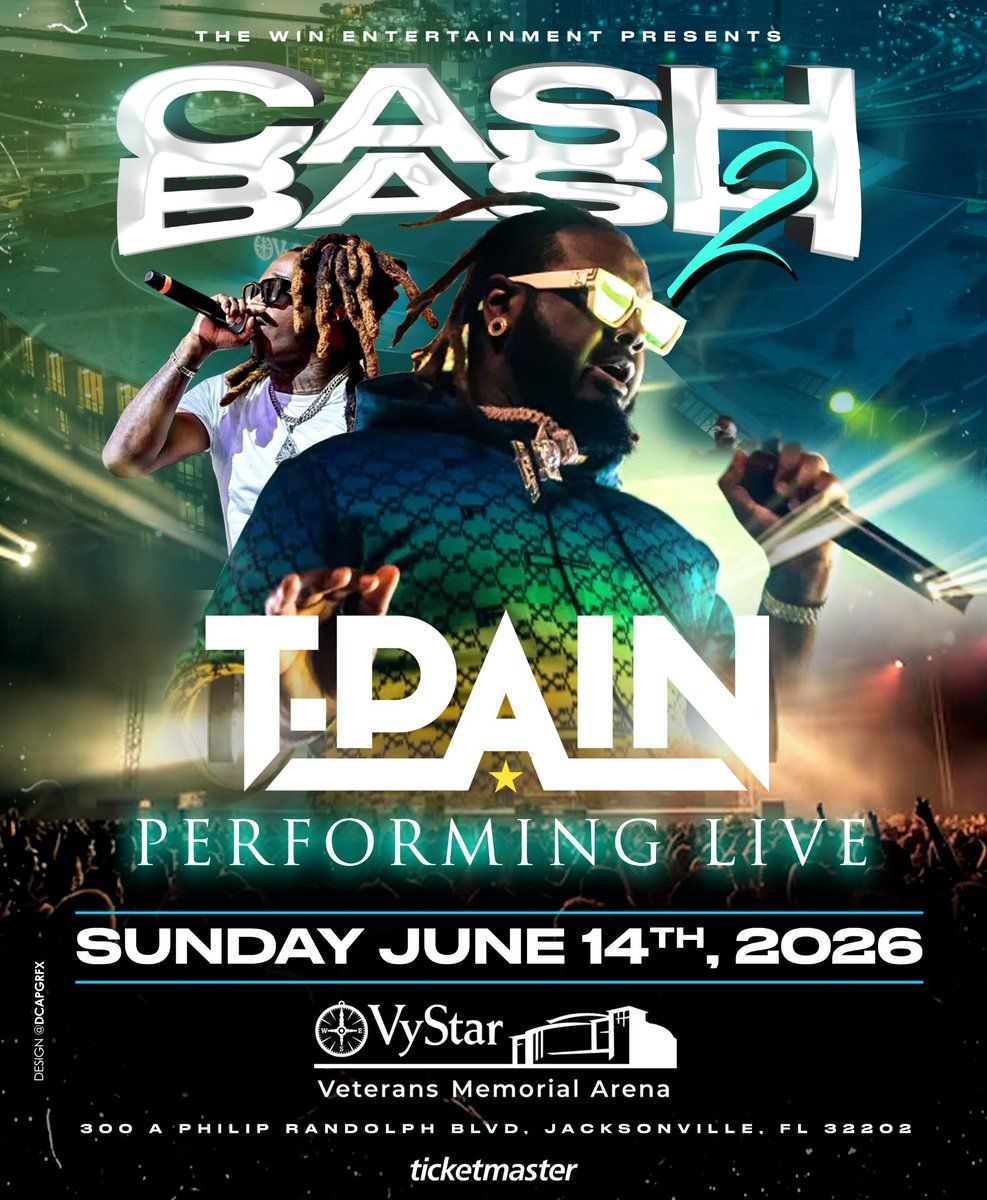 🎉 Welcome to Cash Bash 2: T-Pain, where dreams come alive and possibilities are endless! 🏛️ Join us at VyStar Veterans Memorial Arena in the heart of Jacksonville, FL for an event that defies expectations. 📅 On June 13th, 2026 at 07:00 PM, be part of something truly extraordinary as we bring together innovation, entertainment, and pure magic. ✨ Every aspect has been carefully designed to ensure an unforgettable experience for all our guests. Whether you're seeking adventure, inspiration, or simply a break from the ordinary, this event promises to deliver beyond your wildest dreams. 🎊 Prepare for a journey into the extraordinary!http://maps.seatics.com/VystarVeteransMemorialArena_Endstage5_2025-09-09_2025-09-09_1205_09092025_120753_SVGC_tn.png