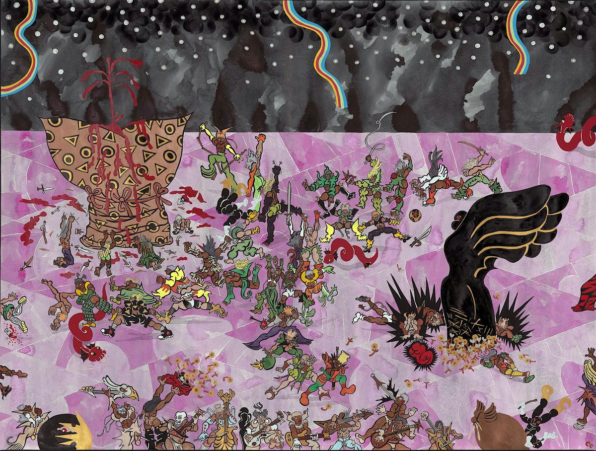 Cash-Cooper is known for heroic-scale depictions of humanity en masse, created within densely populated worlds that pulse with movement, conflict, and transcendence. Drawing inspiration from manga, video games, and cinematic world-building, his work is equally informed by the mythic cosmologies of ancient Egypt and Sumeria, where image-making functioned as a bridge between the earthly and the divine. At the heart of his practice is an intense desire to conjure a magical, autonomous universe. Paracosmos, names both the conceptual framework and the psychological engine of the artist’s practice; a descriptor of how these works come into being, how they operate, and how they ask to be encountered. Paracosmos is not an illustrative universe mapped in advance, but an emergent system—a world that reveals itself through the act of drawing and painting.