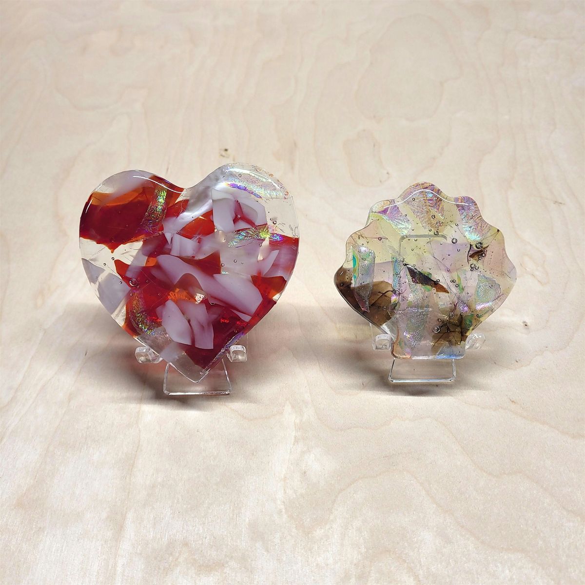 You become the designer and creator by combining clear and colored glass in a mold to create a one of a kind sculpture. In this class, you will use glass fusing methods to create two to three cast shapes (approx. 3-4.5 in diameter) that will brighten your space forever. A variety of glass components, including clear sheet, colored shards, and dichroic elements, will be provided for you to use in creating a layered composition within a metal mold. Using examples and a demonstration provided by your instructor for inspiration, you will plan and assemble your project within the mold. After class, your instructor will heat each assemblage under high temperature to allow the individual glass components to fuse and flow together within the mold and transform into a unique piece of sculptural art glass that is about ¾ in thick. Completed pieces may be picked up the following week.