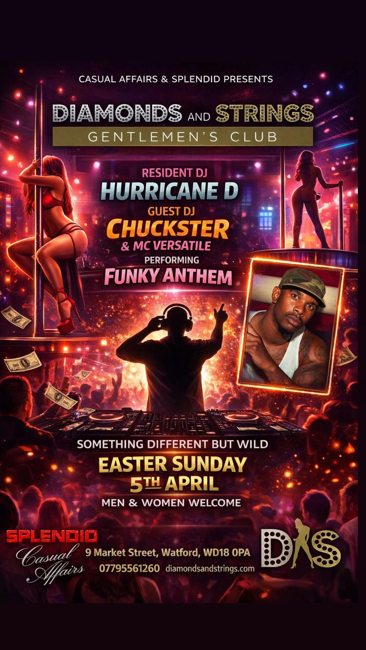 Attention Watford, are you ready?! Join us this Easter Bank Holiday Sunday 5th April where Club Rave fuses with Strip Club vibes!Splendid Events brings us ‘Something New But Different’. A blend of Watford’s hottest dancers and some Old Skool Garage and UK Funky anthems mixed by resident DJ Hurricane D and guest DJ CHUCKSTER & MC VERSATILE performing Funky Anthem.