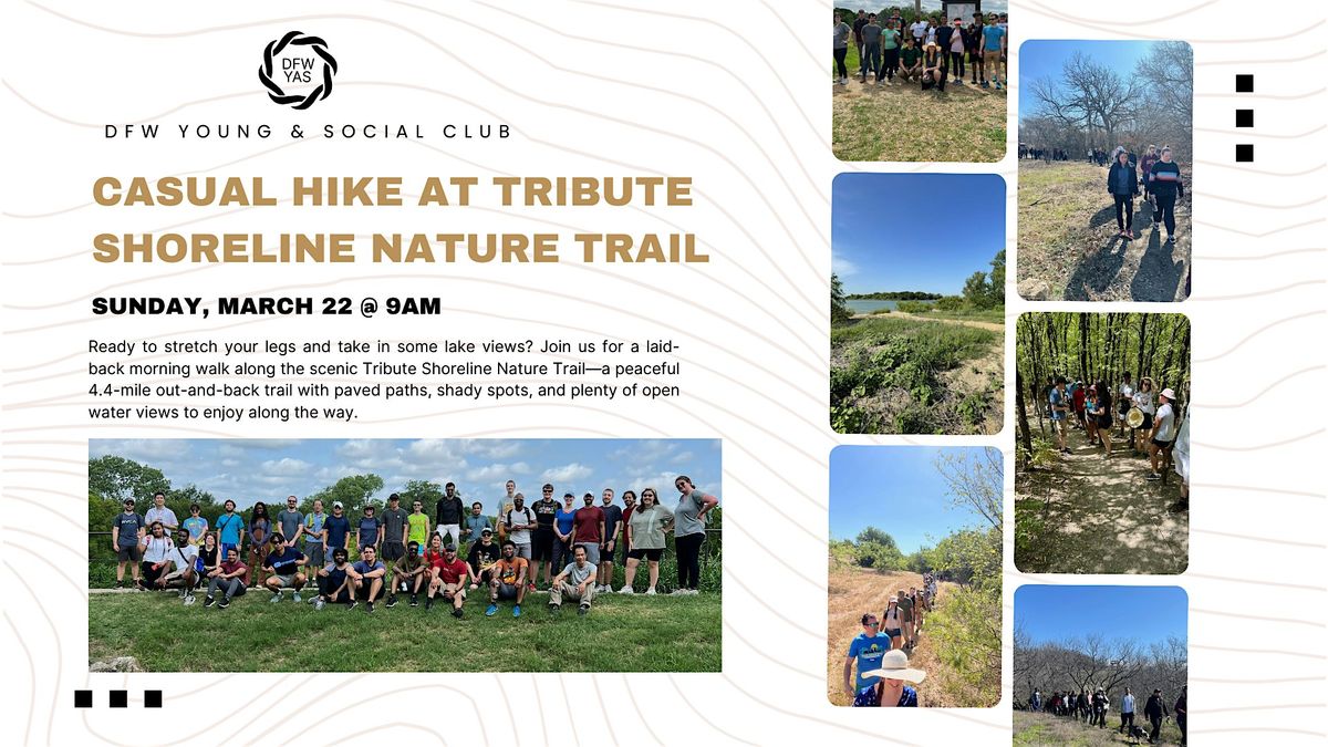 Join us for a laid-back morning walk along the scenic Tribute Shoreline Nature Trail. This is a peaceful 4.4-mile out-and-back trail with paved paths, shady spots, and plenty of open water views to enjoy along the way. It’s a great way to get outside, move your body, and connect with others.