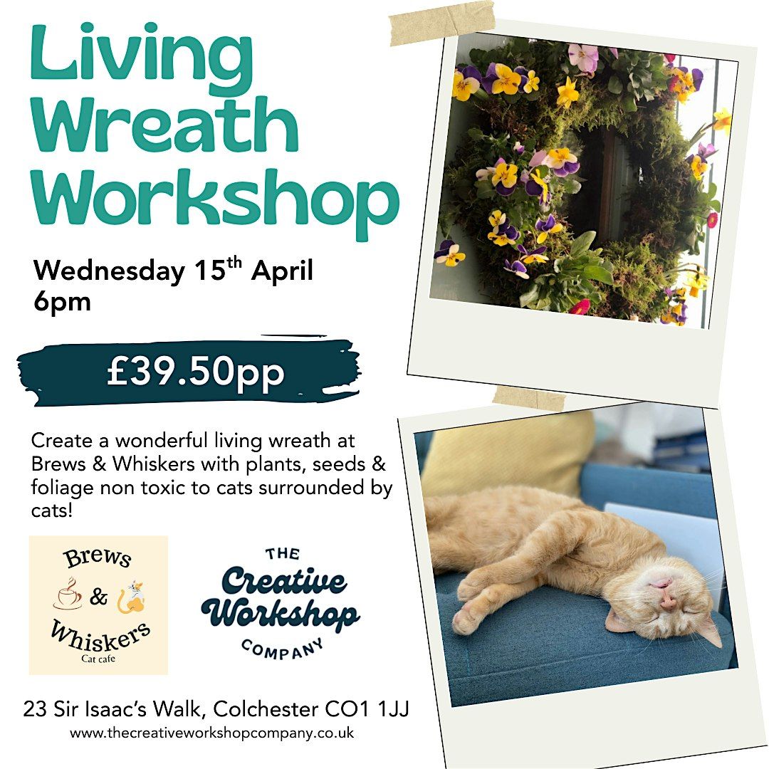 Join us for a calming and creative evening Wednesday 15th April at 6:00pm at Brews & Whiskers, The Cat Café, 23 Sir Isaac’s Walk, Colchester CO1 1JJ for a truly unique evening where you can make your own living wreath to take home and enjoy as it grows.