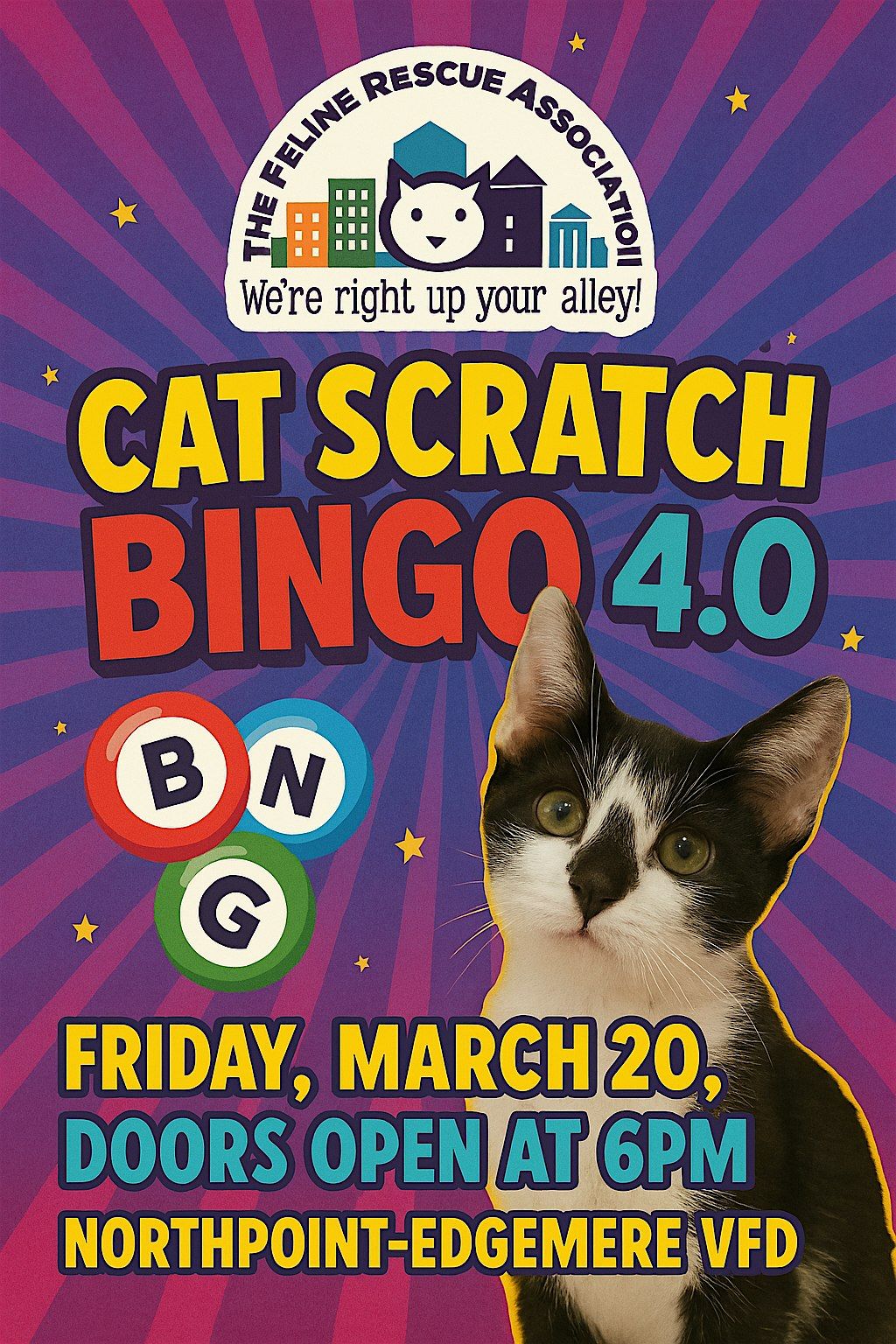 Join us for another meow-tastic bingo night on Friday, March 20th at North Point Edgemere Volunteer Fire Department from 6pm to 9:30pm!