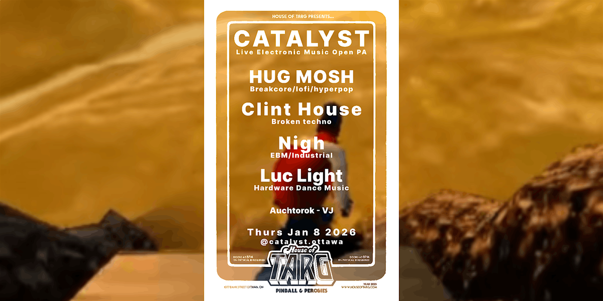 Thursday Jan 8th at HOUSE OF TARG, come see live electronic music performances by HUG MOSH, NIGH, CLINT HOUSE, and LUC LIGHT. VJing by Auchtorok.