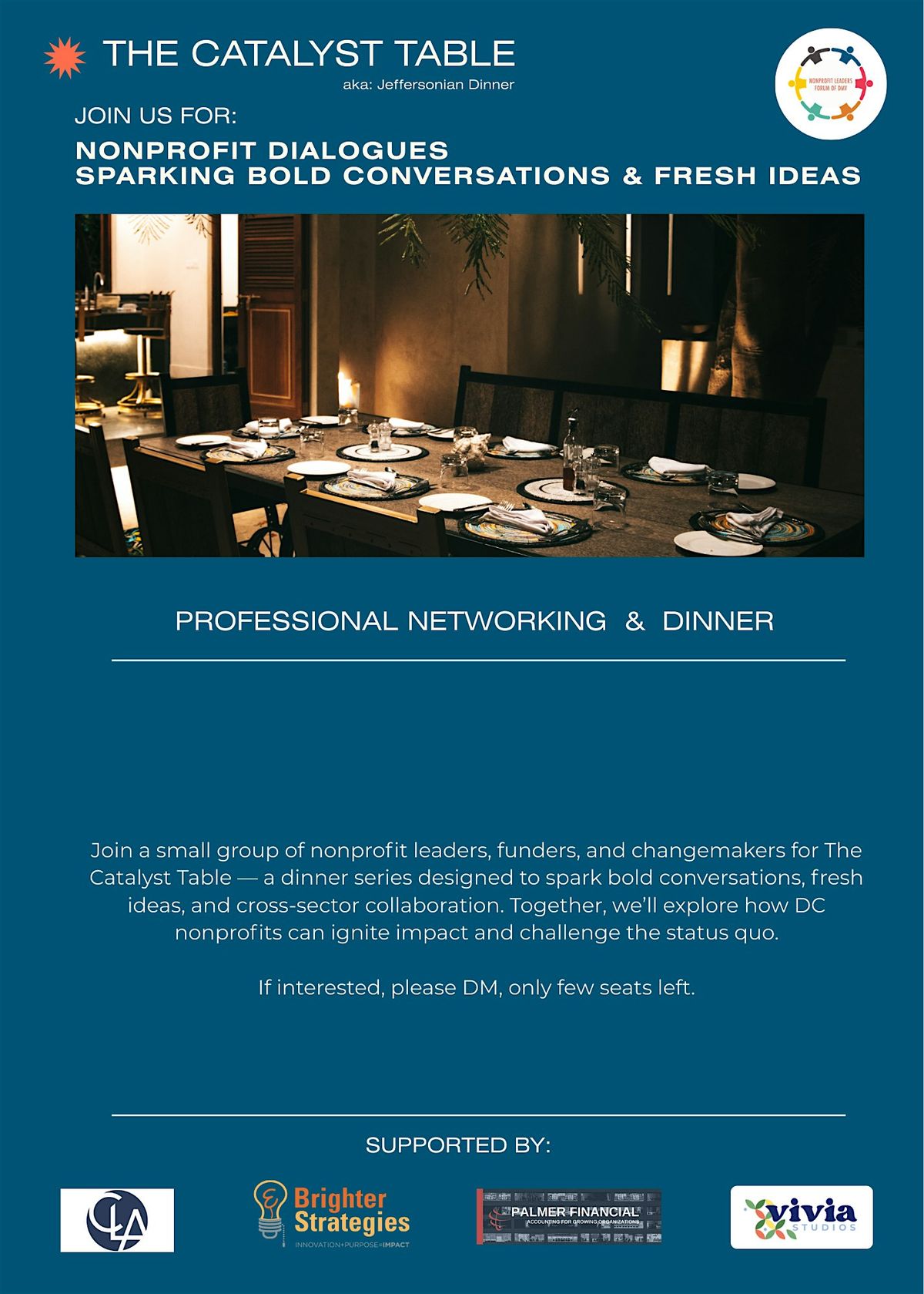Please join us for the "Catalyst Table", a Jeffersonian dinner style of networking and problem solving with your peers. Basic strucutre & format below:
