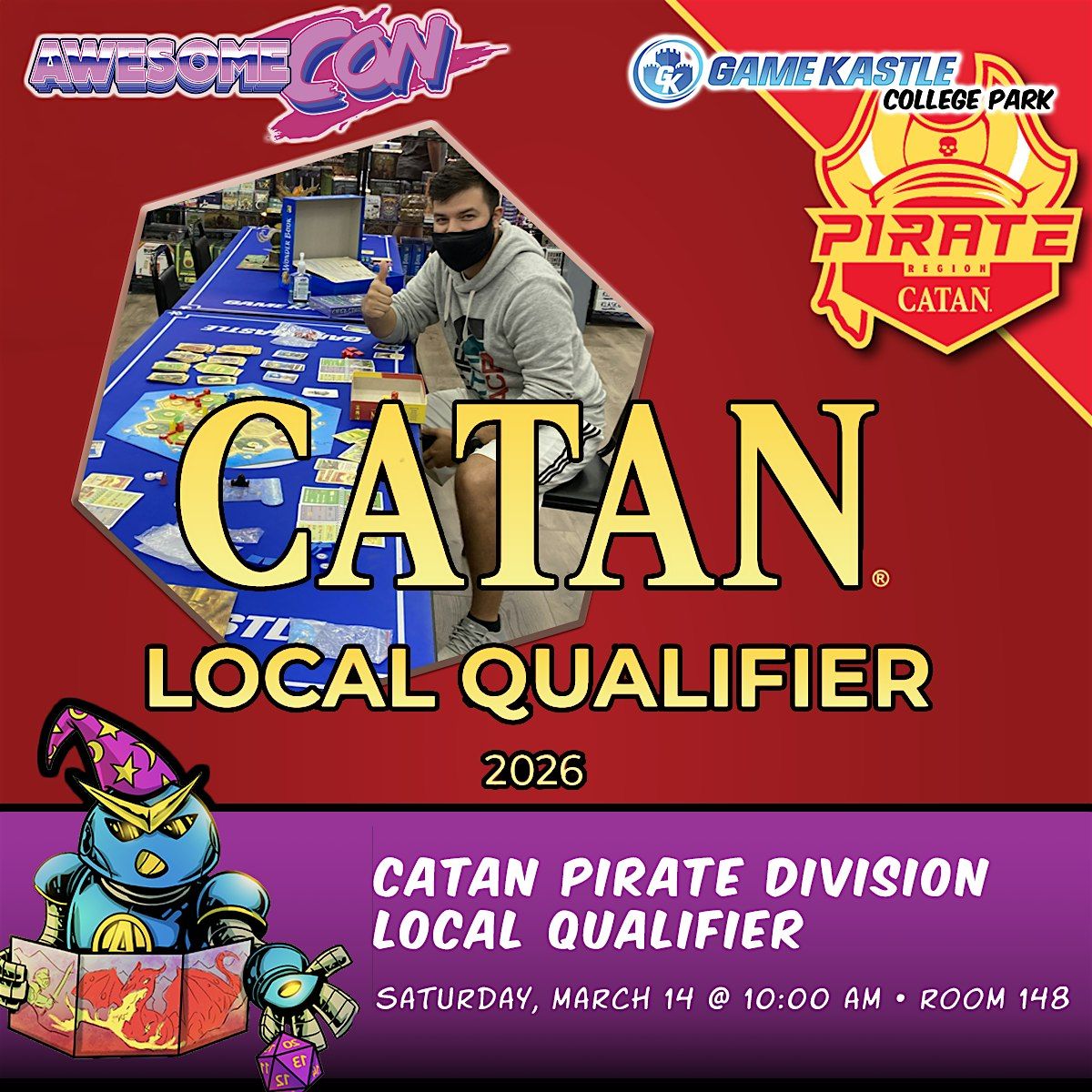Build the longest road! Amass the largest army! Then, roll the dice and send the robber to foil your foes! Awesome Con is hosting a 32-person local qualifying event in the US CATAN National Championships tournament series!