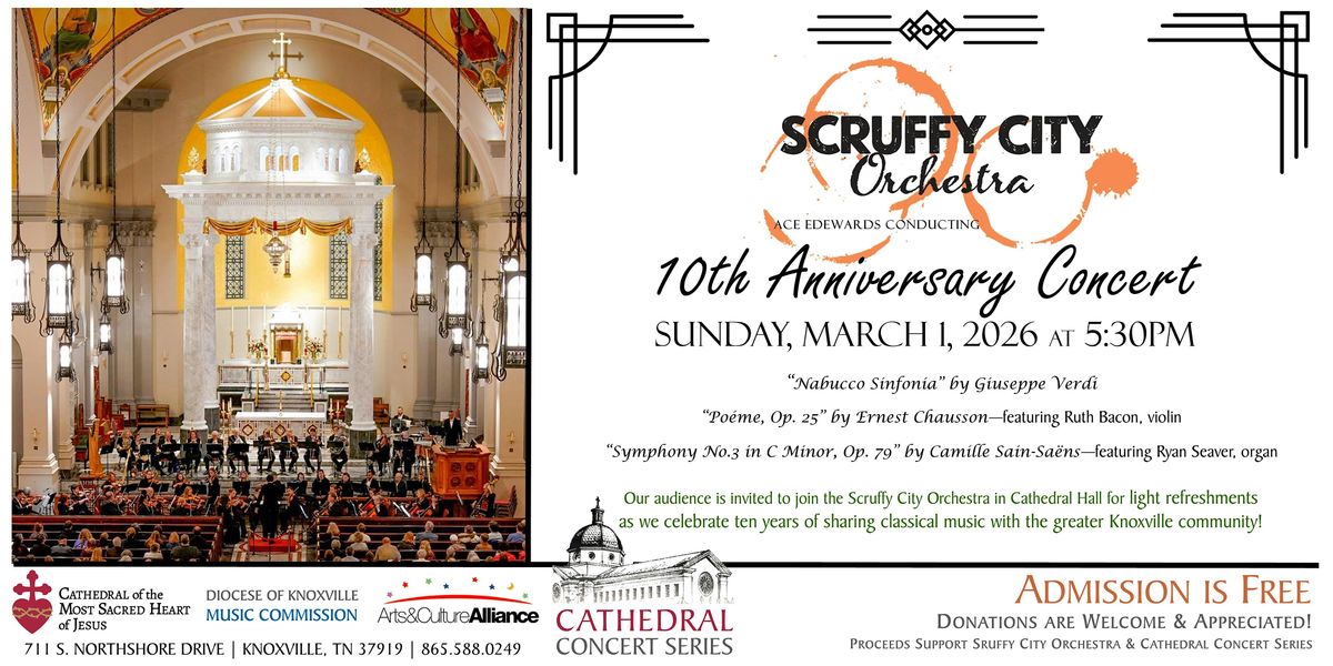 Following the concert, our audience is invited to join the Scruffy City Orchestra in Cathedral Hall for light refreshments as we celebrate ten years of sharing classical music with the greater Knoxville community!