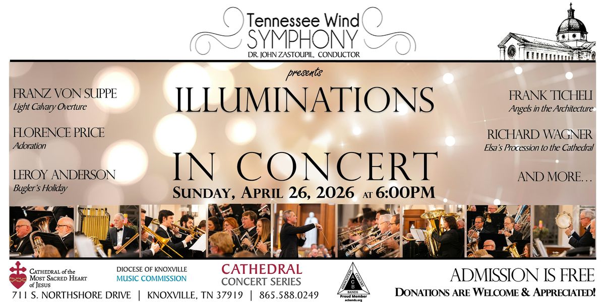 The Cathedral Concert Series is honored to host Tennessee Wind Symphony, under the direction of Dr. John Zastoupil, presenting a thematic concert titled "Illuminations" a program celebrating the beauty and power of music. Throughout history, music has served as a source of light—illuminating moments of celebration, reflection, humor, and spiritual wonder. Tonight’s program explores these musical illuminations, each work casting its own glow.