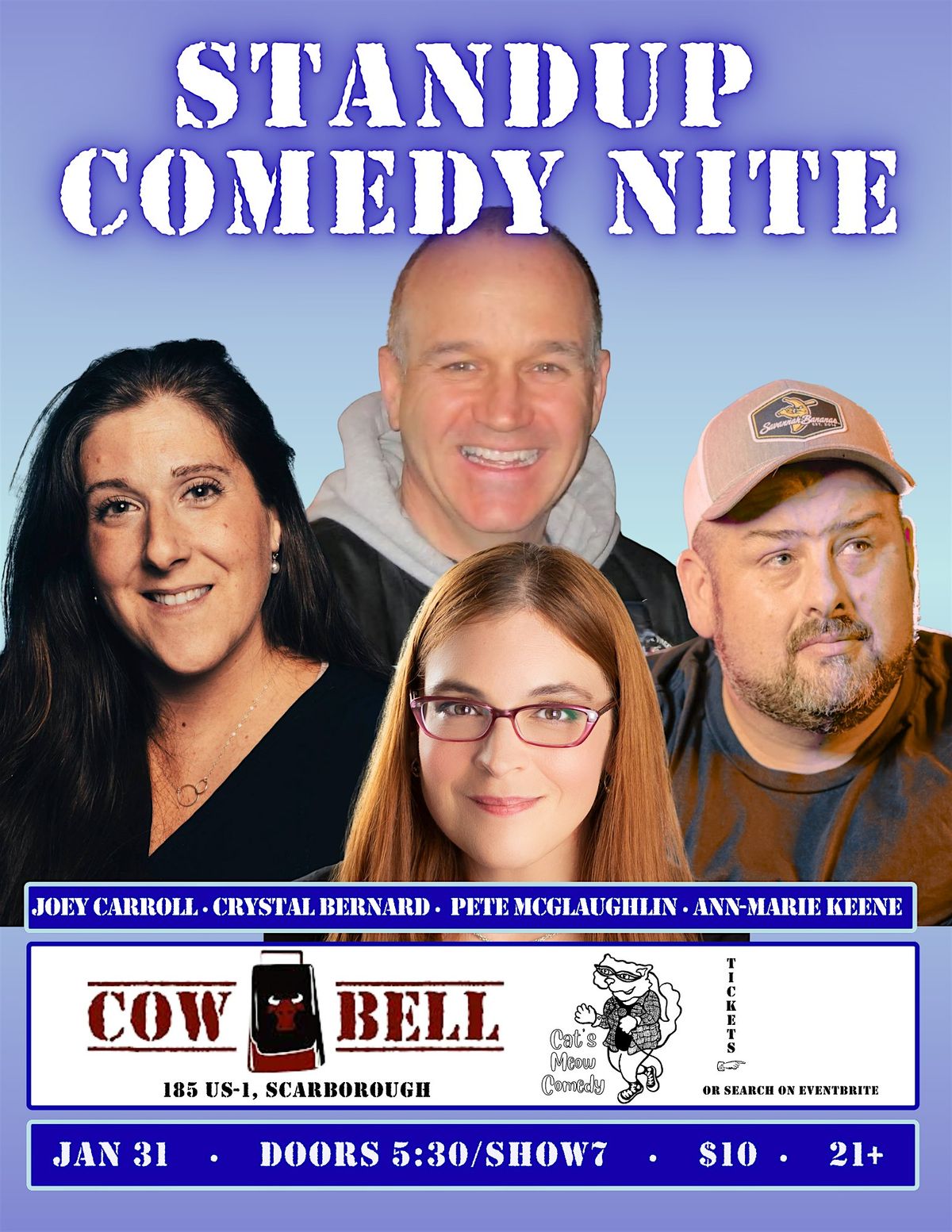 Come out to Cowbell for a standup comedy show with Joey Carroll, Crystal Bernard, Pete McLaughlin, host Ann-Marie Keene, and BONUS GUEST COMEDIANS!!!