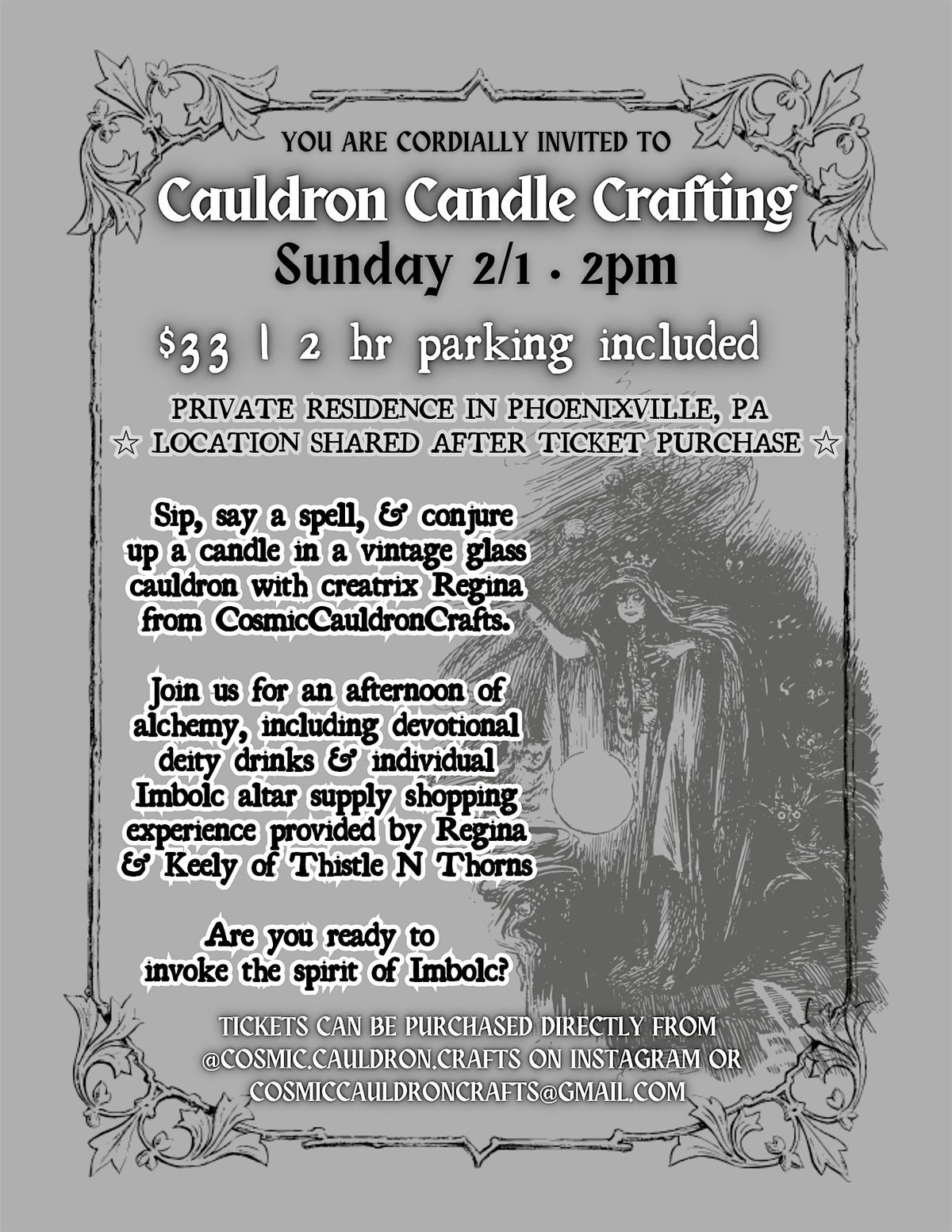 Join us for an afternoon of alchemy, including devotional deity drinks & individual Imbolc altar supply shopping experience provided by Regina & Keely of Thistle N Thorns