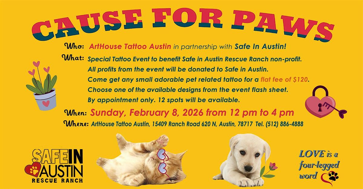 Drumrolls, please!!!, ArtHouse Tattoo Austin announces its 23rd event, - Cause for Paws Tattoopalooza CELEBRATES VALENTINES, this one in partnership with Safe in Austin, an animal rescue ranch. Hooray! This is a very special judgement free space for children and animals that come from abuse or have special needs to visit and feel Safe!