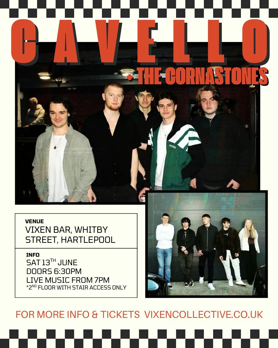 A proper grassroots music event!Cavello are joining us for the first time, bringing their unmistakable indie sound to Vixen with support from The Cornastones. Expect big riffs, sing-along moments and a proper feel-good Saturday night.