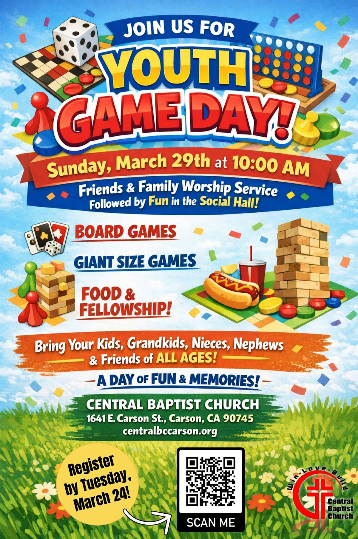 Join us on Sunday, March 29th at 10:00 AM during our Friends & Family Worship Service. Immediately after service we will host our Youth Game Day in the Social Hall.
