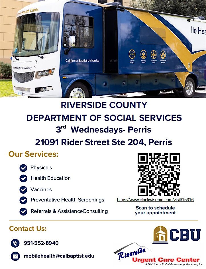 Riverside County Department of Social Services is partnering with California Baptist University’s Mobile Health Clinic to provide free health services to the community.