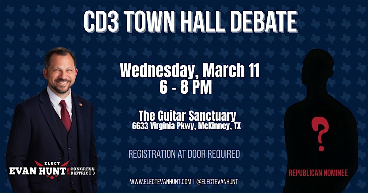 The Republican nominee is officially invited to join us for this event, but will not be confirmed until after the primary. If they don't attend, Evan Hunt will still hold an open Town Hall. No scripted questions.