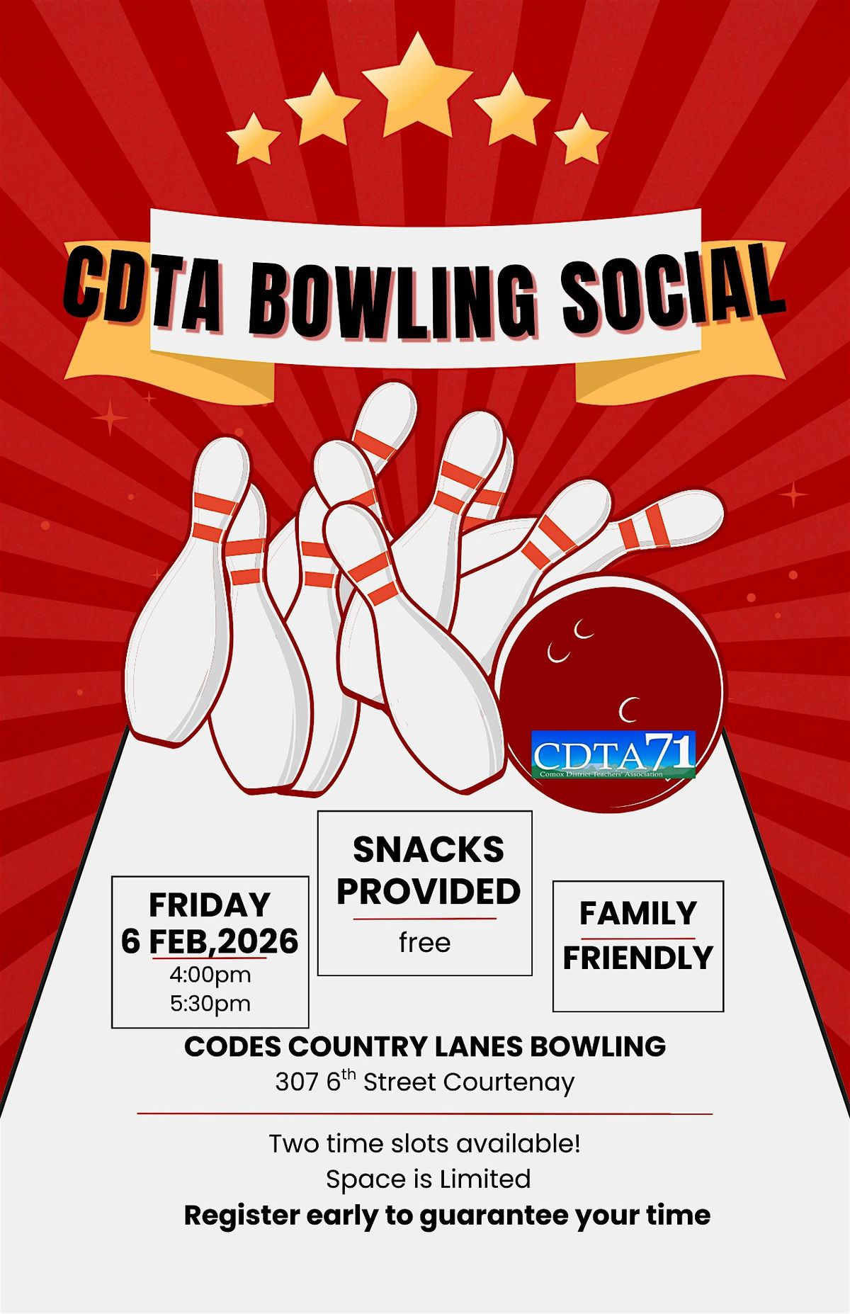 Join us for a fun hour of bowling at Codes Country Lanes on Friday February 6th from either 4-5pm or 5:30-6:30pm. You chose the time slot that works best for your and your group. It’s a great chance for us to gather in person to roll some strikes, share laughs, enjoy snacks and be in great company. This is a family friendly event where everyone’s welcome. Don’t miss out on this laid-back, good-time event. Grab your shoes and let’s bowl!