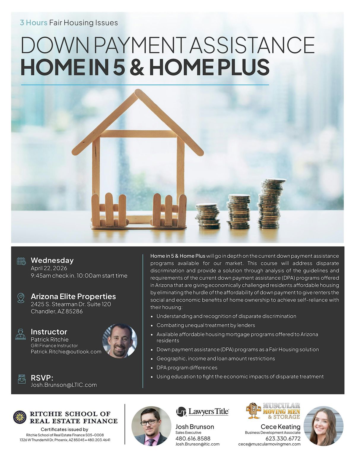 Down Payment Assistance – Home in 5 & Home Plus (3 Hours Fair Housing Issues) will go in depth on the current down payment assistance programs available for our market. This course will address disparate discrimination and provide a solution through analysis of the guidelines and requirements of the current down payment assistance (DPA) programs offered in Arizona that are giving economically challenged residents affordable housing by eliminating the hurdle of the affordability of down payment to give renters the social and economic benefits of home ownership to achieve self-reliance with their housing: