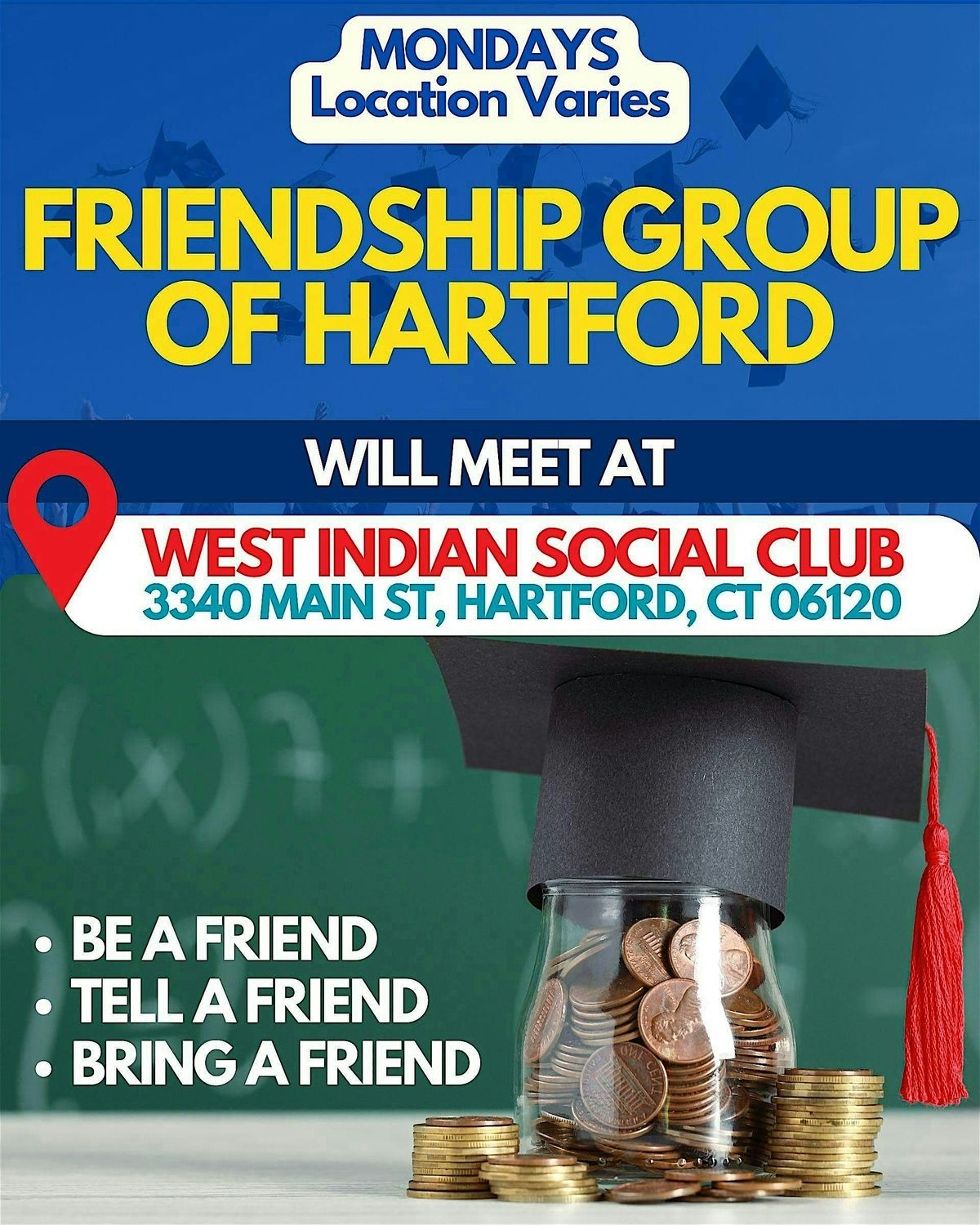 Join us Monday nights for the Friendship Group of Hartford (FGOH) meetup for a good cause, location varies. BE A FRIEND – TELL A FRIEND – BRING A FRIEND. This event benefits friendship group scholarship funds.