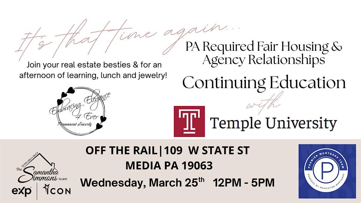 Join us for a day Continuing Education Day at Off the Rail on Tuesday, March 25th from 12–5 PM. We’re bringing an instructor from Temple University’s CE program to teach the required 5-hour Fair Housing & Agency course in a chill, welcoming setting.