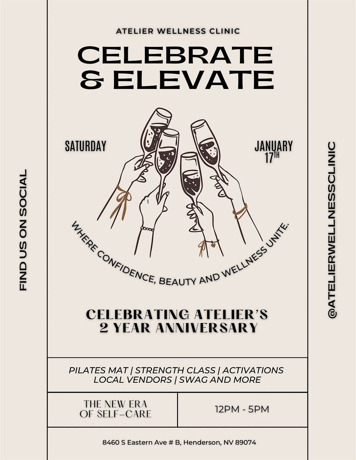 Celebrate & Elevate is a wellness-forward social event honoring two years of beauty, confidence, and community at Atelier Wellness Clinic. Join us for an elevated experience featuring local vendors, movement, skincare, and curated wellness activations—all designed to help you feel your best from the inside out. This celebration is about connection, self-care, and stepping into your highest glow as we toast to two amazing years.