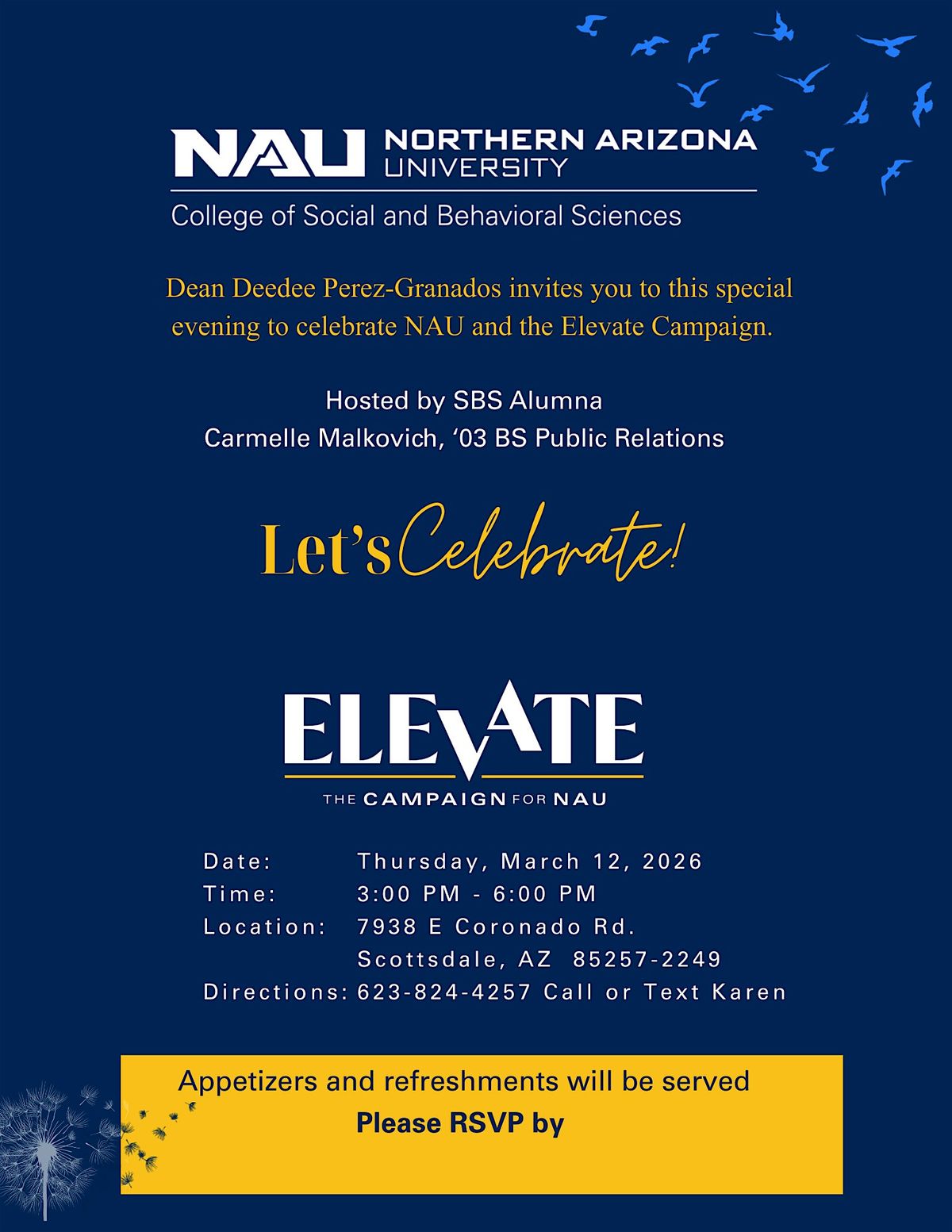 Dean Deedee Perez-Granados invites you this this special evening to celebrate NAU and the Elevate Campaign. This event is generously hosted by SBS alumni Carmelle Malkovich, ‘03, School of Communication