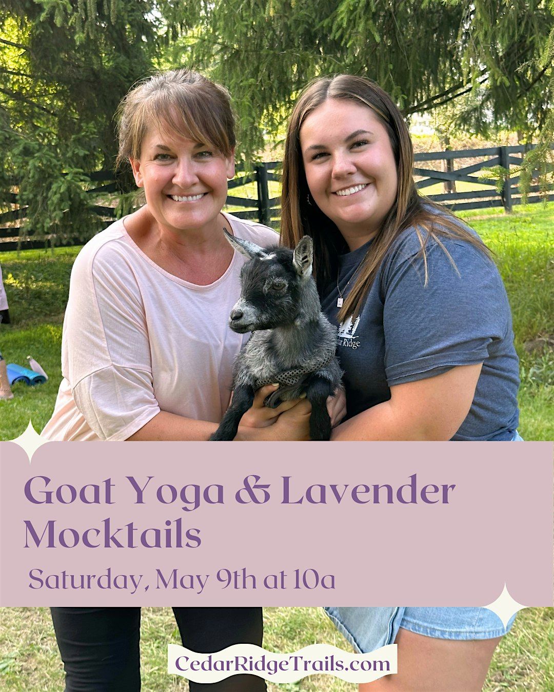 Join us At Cedar Ridge Trails flower farm in Miamisburg, Ohio for a fun morning celebrating mom! In this workshop you’ll have a 1-hour open-air goat yoga session with the world’s most adorable goats, followed by enjoying lavender-inspired mocktails and assembling a bundle of pre-cut spring flowers from our flower cart to bring home. This event is perfect for all ages!