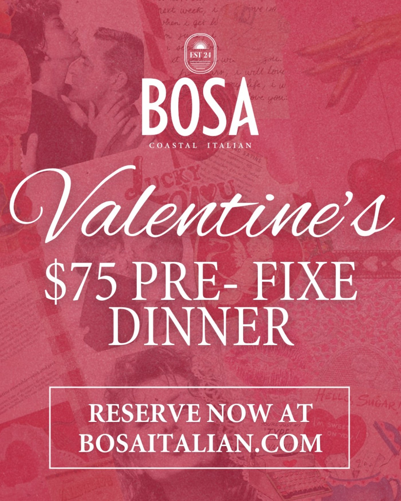 Downtown Haverhill hotspot BOSA Coastal Italian, offering panoramic views of the Merrimack and an ambiance inspired by coastal Europe, will celebrate Valentine's Day with a four-course prix-fixe menu ($75 per person). For the first-course, guests can choose from a Caesar Salad, Arancini, Beet Salad, Burrata Bruschetta, or Chilled Tuna Crudo. Second-course options include Paccheri Pasta, Gnocchi Pesto, or Mushroom Agnolotti, served with fresh shaved black truffle, creamy ricotta, brown butter, crispy parmesan, and green onion. The third-course features a variety of entrées, including Crispy Chicken Milanese, White Bolognese, Baked Chicken Parmesan, Butternut Squash Risotto, Baked Cod, and Land & Sea—a petite filet and jumbo prawns served with red wine demi and braised cipollini. To end on a sweet note, guests can indulge in Tiramisu, Cannoli, a Brownie Skillet Sundae, or Basque Cheesecake, served with a raspberry compote, Chantilly cream, and citrus.