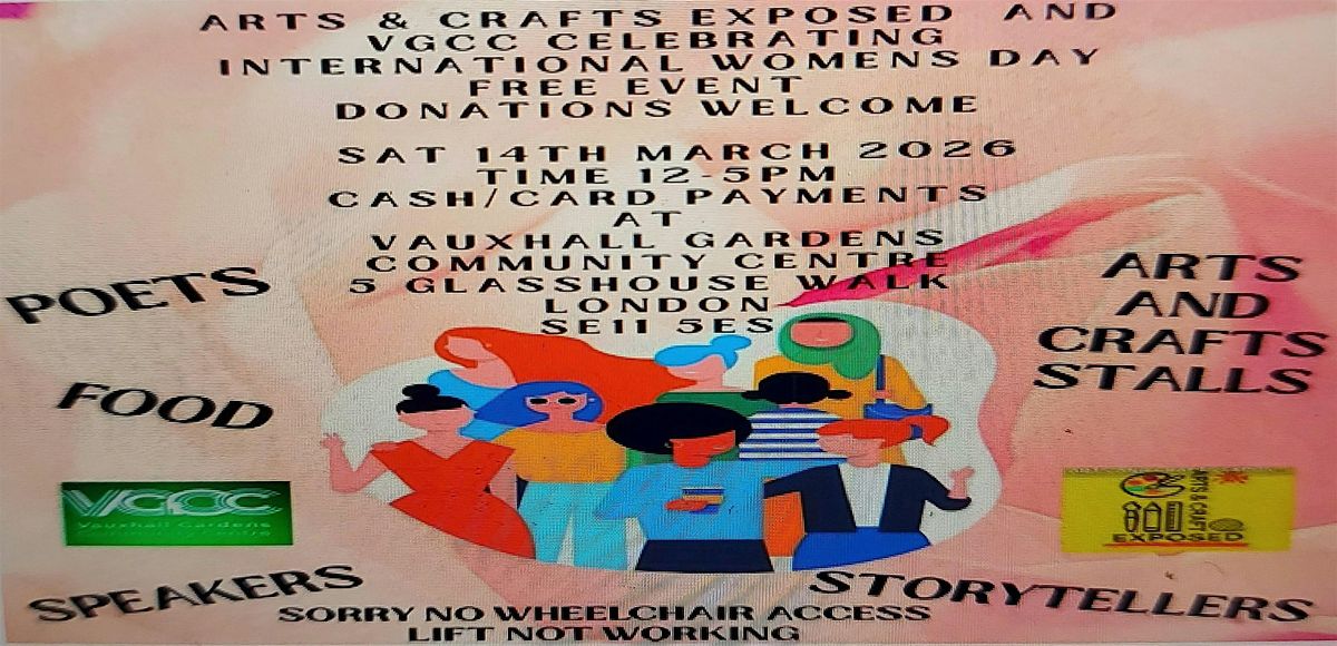 Join us at Vauxhall Gardens Community Centre on March 14, 2026 at 12:00 PM (GMT) for a fun and inspiring day! We'll be celebrating International Women's Day with great company, artists, henna hand artist, speakers, craftmakers, a raffle and lots of positive vibes. Come along to connect, share stories, and support each other in a relaxed, friendly atmosphere. Everyone’s welcome—let’s make it a day to remember! (donations appreciated) Organisers Angela Dinnall, Vauxhall Gardens Community Centre, Eromillage Textiles. email - [email protected] or [email protected]