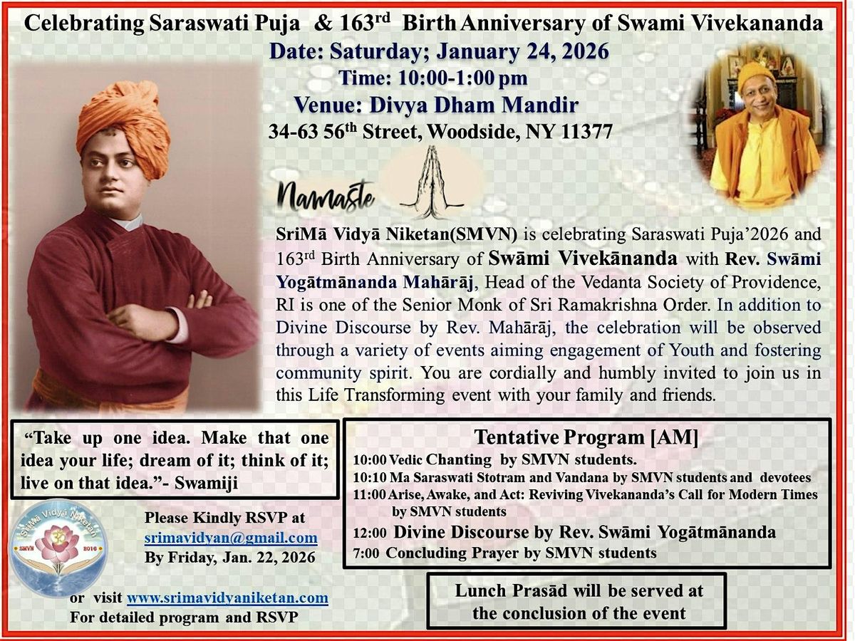 SriMā Vidyā Niketan (SMVN) is celebrating Saraswati Puja 2026 and the 163rd Birth Anniversary of Swami Vivekānanda with Rev. Swami Yogātmānanda Mahārāj. In addition to the Divine Discourse by Rev. Mahārāj, the celebration will be observed through a variety of events aiming engagement with the Youth and fostering community spirit.