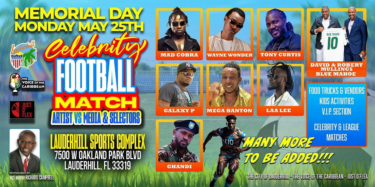 Get ready for high-energy action, star power, and community vibes! On Monday, May 25, 2026, Lauderhill Sports Park transforms into the ultimate playfield as artists and selectors go head-to-head in an unforgettable celebrity football showdown! ⚽🔥 Expect electrifying goals, music, laughter, elite talent, delicious food, vendors, family fun, and nonstop energy all day long. This is football meets entertainment — a must-see celebration of culture, competition, and community spirit! 🎉🎶
