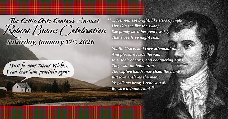 The Celtic Arts Center, in partnership with The Mayflower Club, will celebrate The Bard of Scotland , Robert Burns, with a wonderful evening of food, poetry readings, Burns songs, a Highland piper, Scottish music and more. Saturday, January 17th, 2026 will be the long-awaited return of celebrating the event in-person and this year we once again invite our guests to participate. Those interested will be given an opportunity to stand up and share one of Burns poems, songs, or give a toast as part of this more intimate and casual Burns Supper. The doors open at 6PM and the ceremony/dinner begins at 7PM.