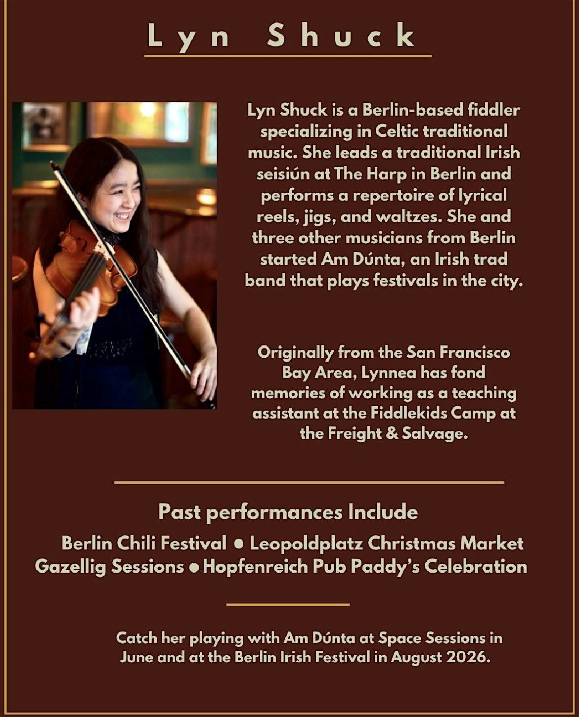 We are delighted to welcome talented young musicians Lyn Shuck . Lyn is a Berlin-based fiddler specializing in Celtic traditional music. She leads a traditional Irish seisiún at The Harp in Berlin and performs a repertoire of lyrical reels, jigs, and waltzes. She and three other musicians from Berlin started Am Dúnta, an Irish trad band that plays festivals in the city.