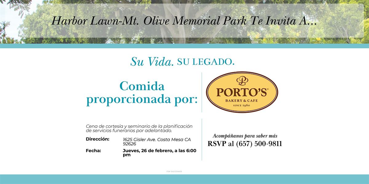 Te invitamos a una cena completamente gratuita cortesía de Porto's Bakery & Café mientras aprendes sobre la importancia de la planificación anticipada en un ambiente cómodo, relajado y sin presión.