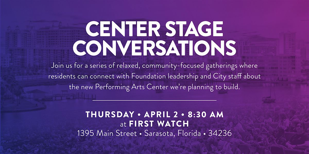 Sarasota Performing Arts Foundation, in partnership with the City of Sarasota, invites the community to participate in Center Stage Conversations, a new series of informal gatherings designed to spark meaningful dialogue about the Performing Arts Center we’re planning to build.