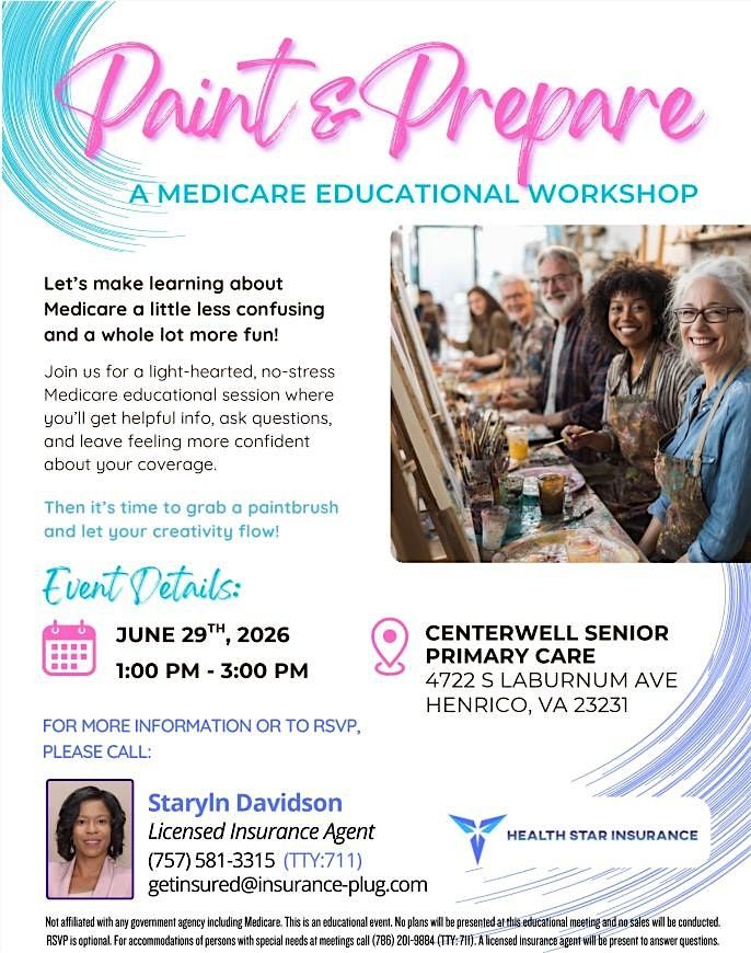 Welcome to CenterWell Paint & Sip Medicare Educational event! Join us for a fun and informative in-person gathering at CenterWell Senior Primary Care. This event is your chance to learn more about Medicare while enjoying a relaxing painting session. Grab a brush, sip on your favorite beverage, and let's dive into all things Medicare together. Don't miss out on this unique opportunity to socialize, create, and educate yourself in a welcoming environment. See you there!