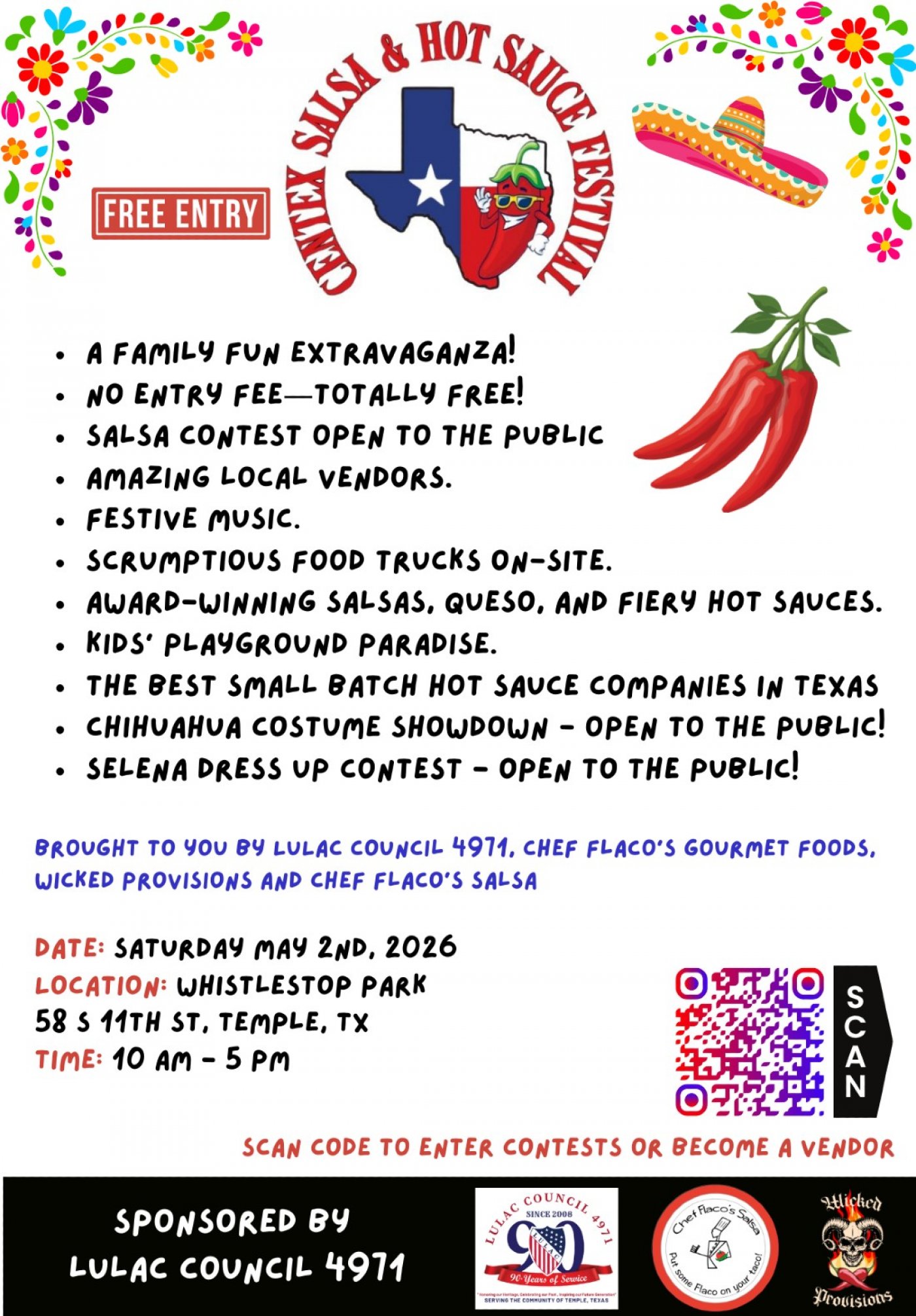 This 3rd annual Temple event benefits the League of United Latin American Citizens (LULAC) Council 4971, which raises funds for local student scholarships. The festival is proudly hosted by Chef Flaco’s Gourmet Foods in partnership with LULAC Council 4971. What to Expect:• Free-Open to the Public- A Salsa tasting contest, A Chihuahua Best Dressed Contest, and a Salena Look-A-Like cContest • Amazing local vendors• Live music• Mexican Dancers, and Food trucks. Go to the website to register for any of the contests and to become a vendor.