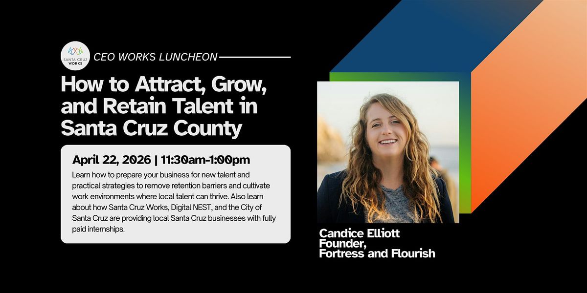 Santa Cruz County’s economic future depends not just on attracting talent, but on employers’ ability to develop, support, and retain the young professionals who want to build their lives and careers here. In this talk, Candice Elliott, Vice President of People and Culture at Unraid and Founder at Fortress and Flourish HR Strategy, draws on her experience advising innovative organizations to explore why recruiting local talent is a smart business strategy, what young professionals actually need to succeed at work, and where employers often unintentionally create barriers to retention. Designed for CEOs and senior leaders, the session offers practical, realistic insights on how to cultivate work environments where both employers and employees thrive while strengthening the local workforce and economy. Also learn about how Santa Cruz Works, Digital NEST, and the City of Santa Cruz are providing local Santa Cruz businesses with fully paid internships.