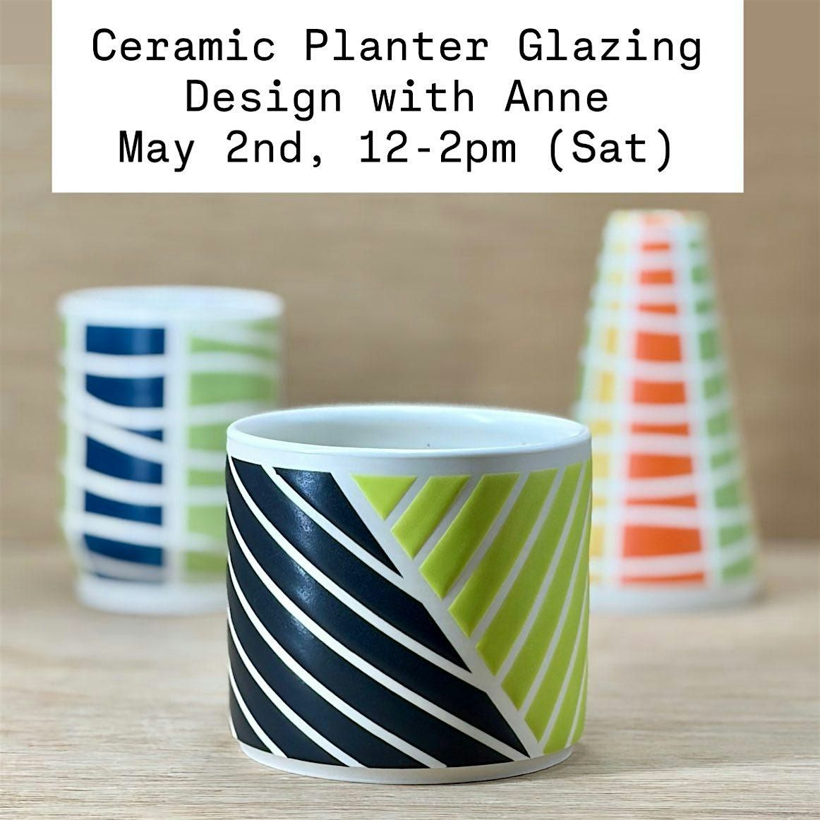 In this hands-on workshop for adults and older teens, participants will create a design on their own ceramic planter (already wheelthrown by Anne) using tape resist and glaze application. Anne will demonstrate her approach to mapping out and applying taped designs, as well as how to glaze a piece effectively. She will also have some of her finished pieces on hand to help visualize the end result.