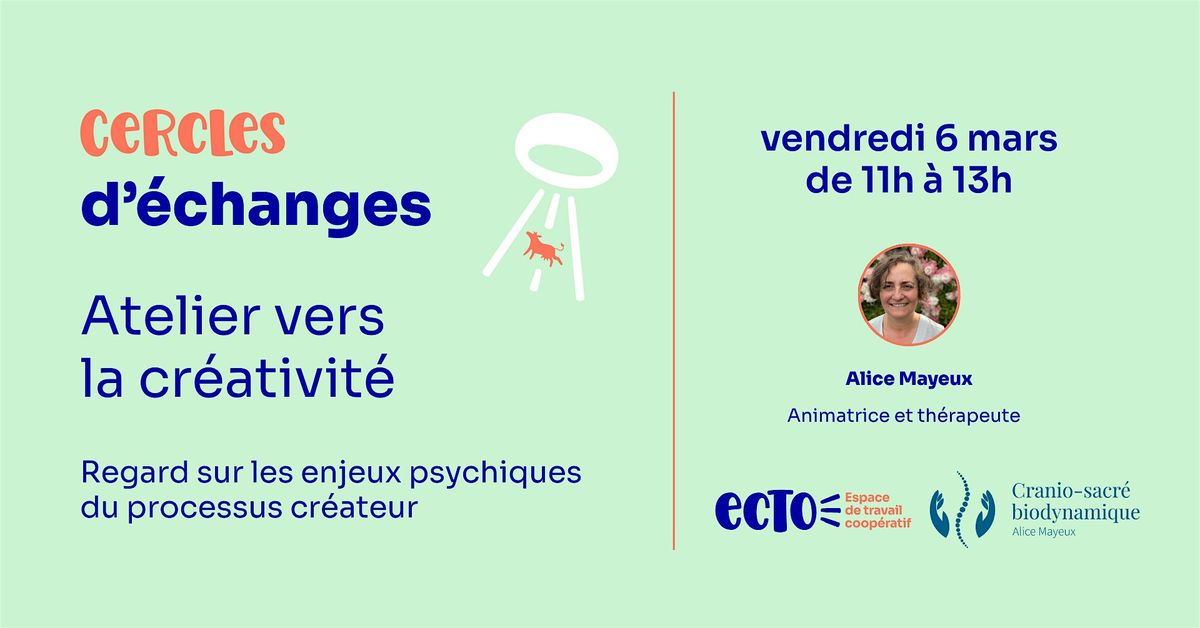 Alice vous invite pour une série de cercles d’échanges mensuels. Est-ce que l’on suit nos élans créatifs? Si non, pourquoi? Et comment une attitude plus créative peut changer le monde (l’environnement dans lequel on évolue) ? En mars, on explore les enjeux psychiques du processus créateur et les impacts sur la régulation du système nerveux. Toujours dans une perspective de nous rendre la vie plus agréable.